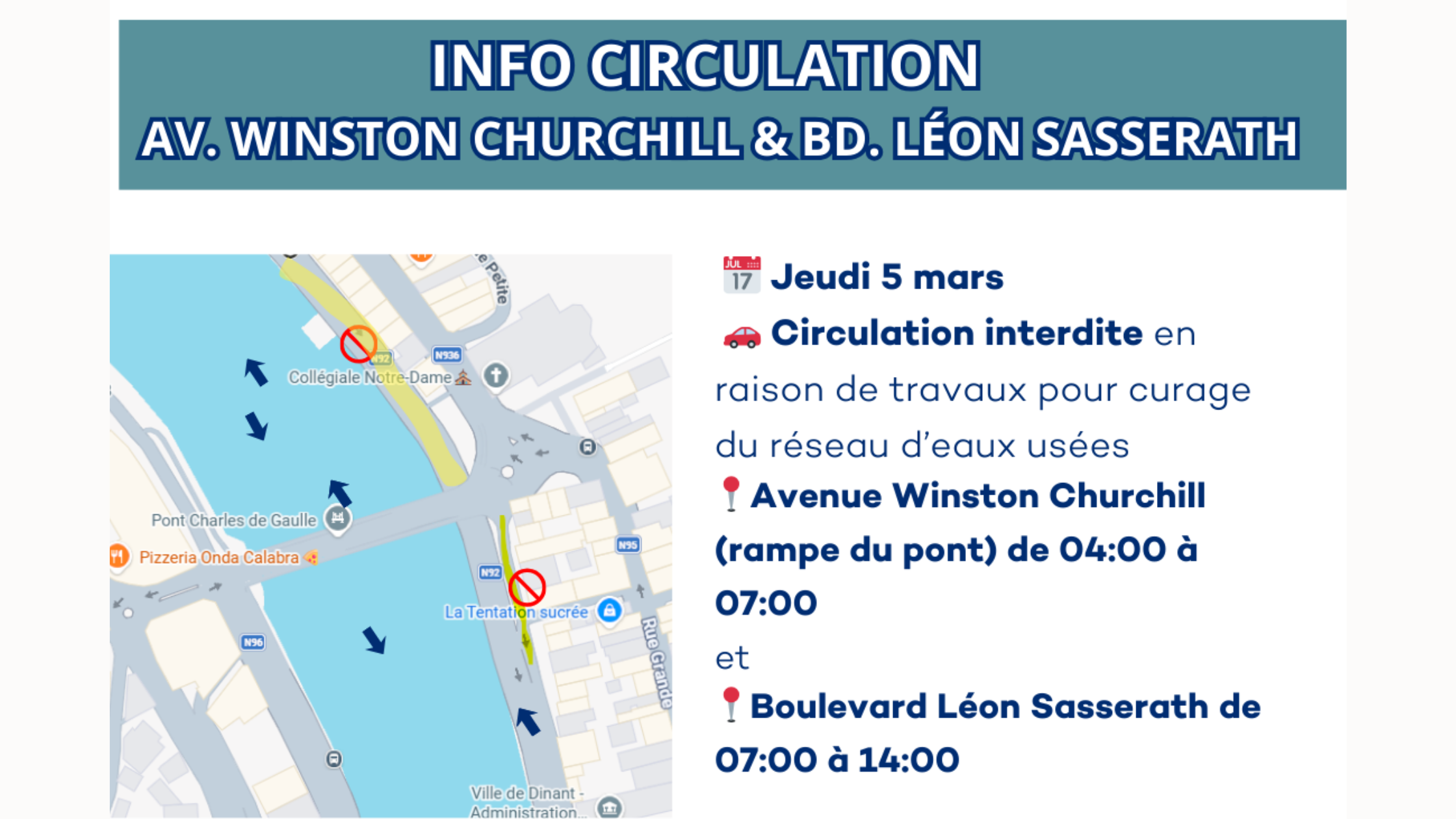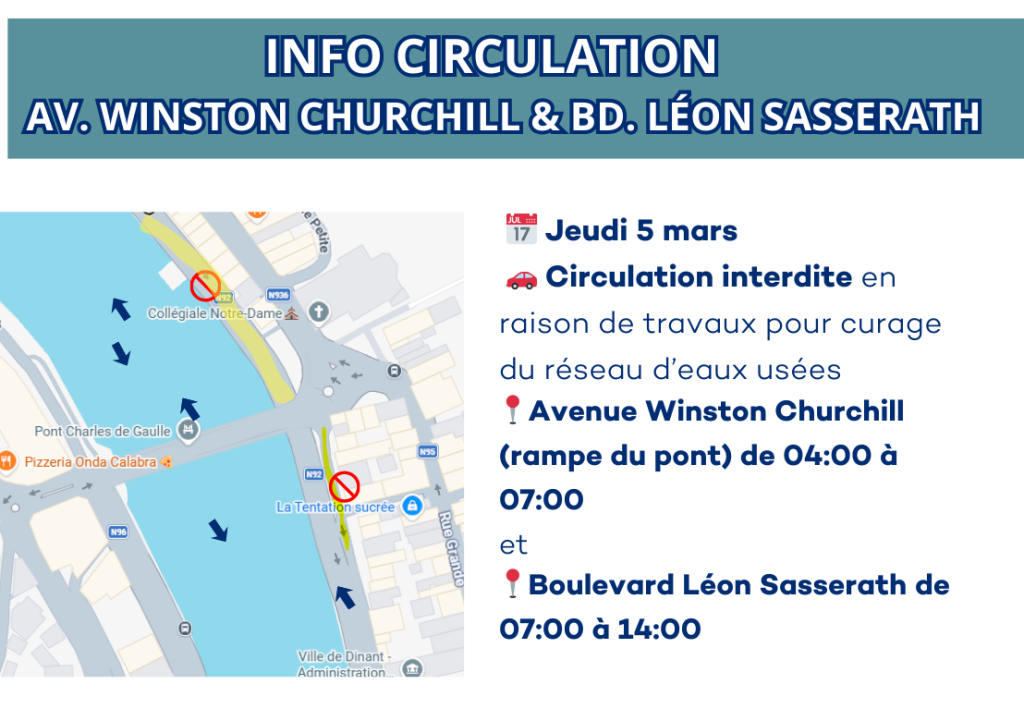 Des travaux de curage du réseau d’eaux usées seront effectués ce jeudi 5 mars 2026 à Dinant.
