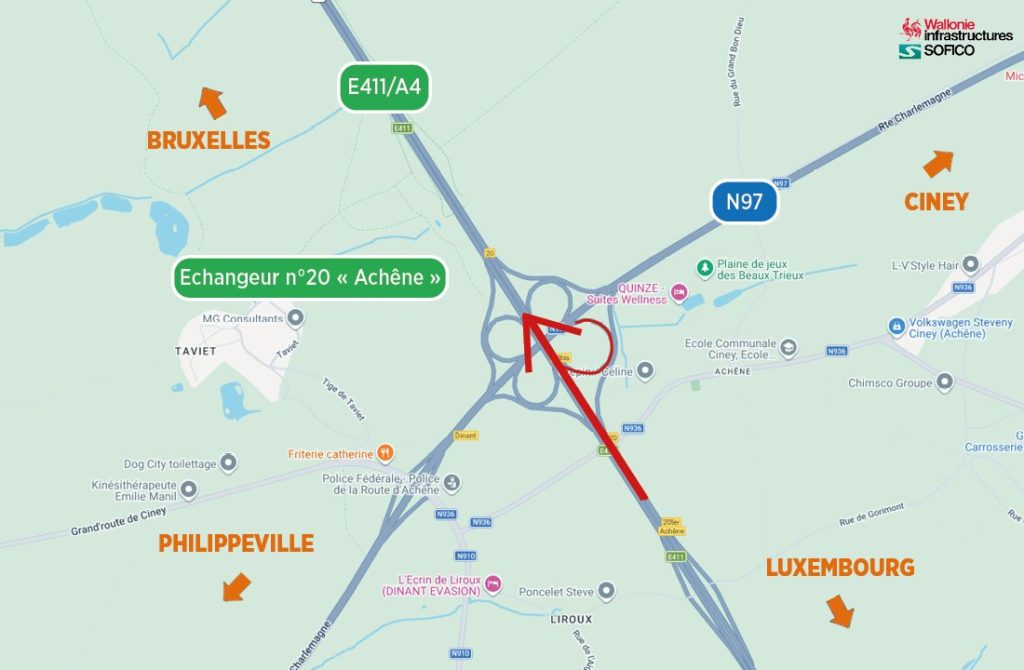 - La bretelle connectant la N97 venant de Philippeville à l’E411/A4 vers Bruxelles sera fermée.