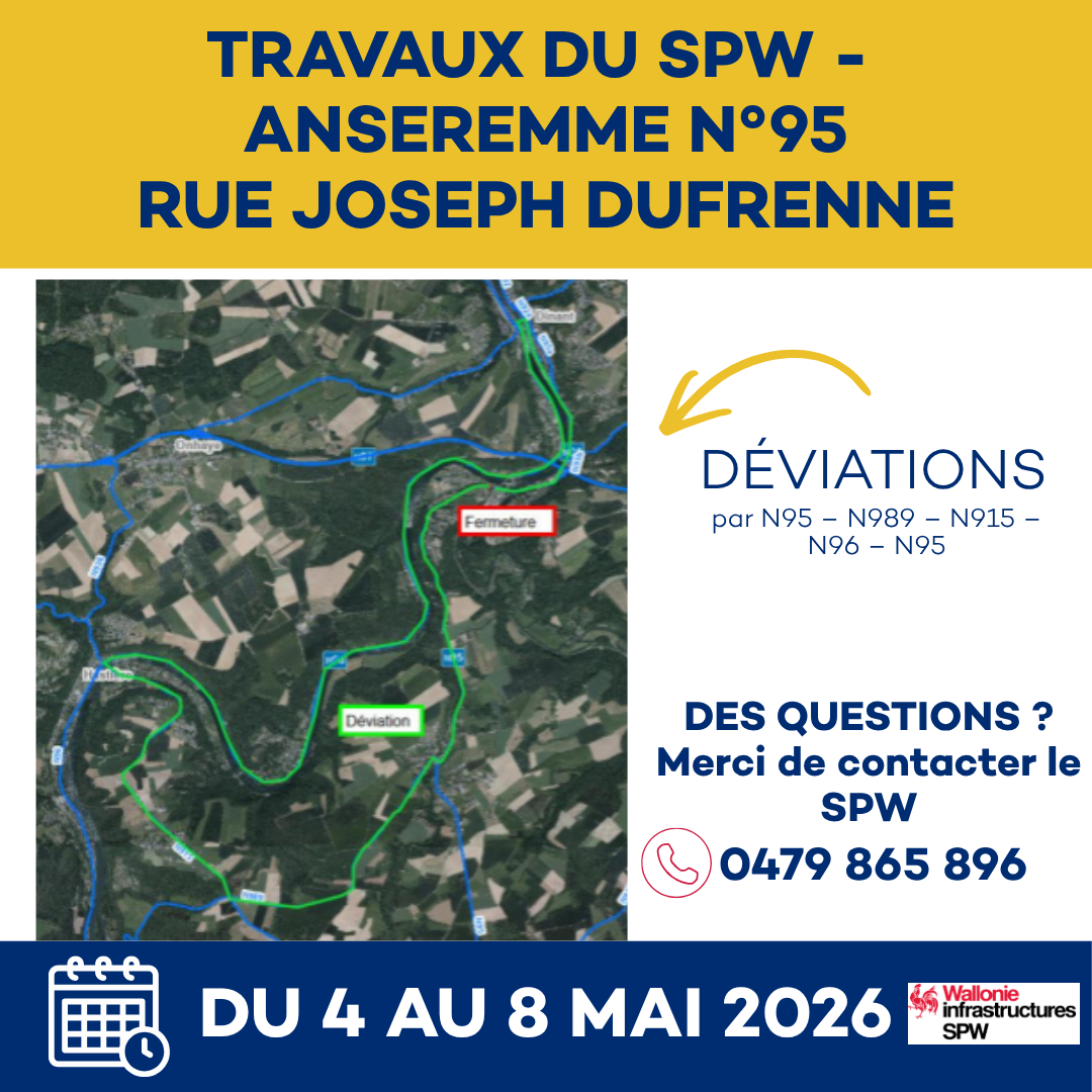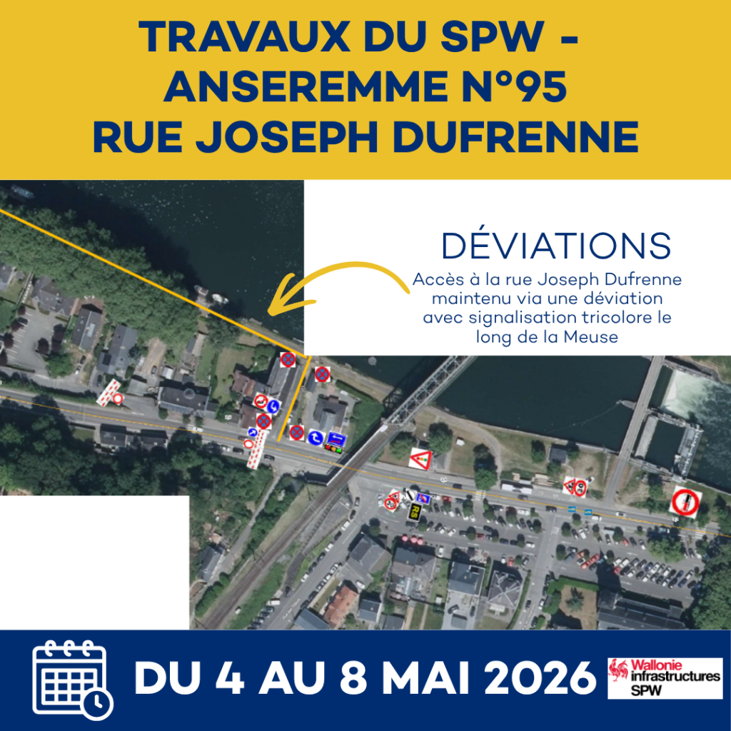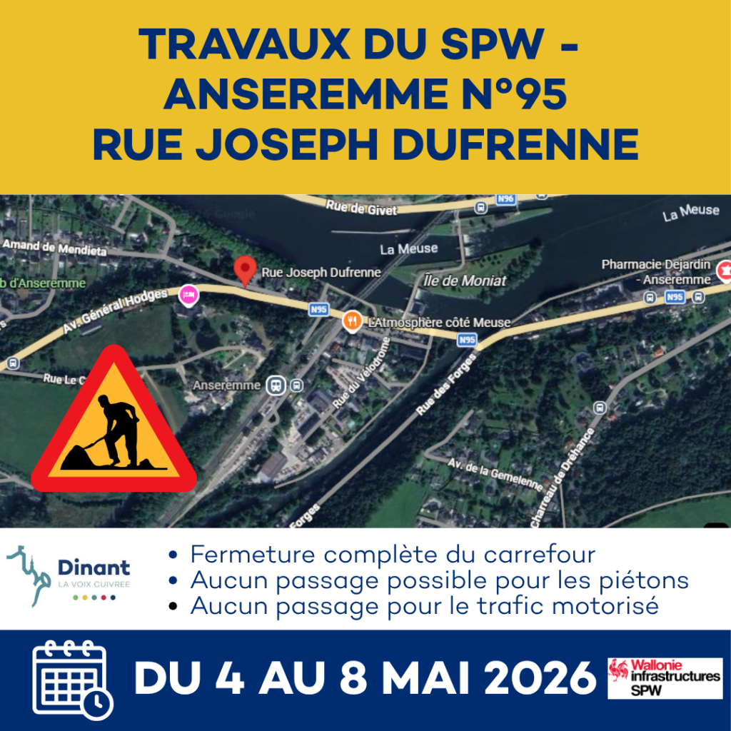 La Ville de Dinant vous informe que le SPW réalisera des 𝘁𝗿𝗮𝘃𝗮𝘂𝘅 𝗱𝗲 𝘃𝗼𝗶𝗿𝗶𝗲 sur la N95 𝗮̀ 𝗹𝗮 𝘀𝗼𝗿𝘁𝗶𝗲 𝗱’𝗔𝗻𝘀𝗲𝗿𝗲𝗺𝗺𝗲 𝘃𝗲𝗿𝘀 𝗙𝗮𝗹𝗺𝗶𝗴𝗻𝗼𝘂𝗹 𝗱𝘂 𝟰 𝗺𝗮𝗶 𝗮̀ 𝟲𝗵 𝗮𝘂 𝟴 𝗺𝗮𝗶 𝗮̀ 𝟮𝟬𝗵. Plus plus précisément au niveau du carrefour situé entre l’Avenue General Hodges et de la rue Joseph Dufrenne.