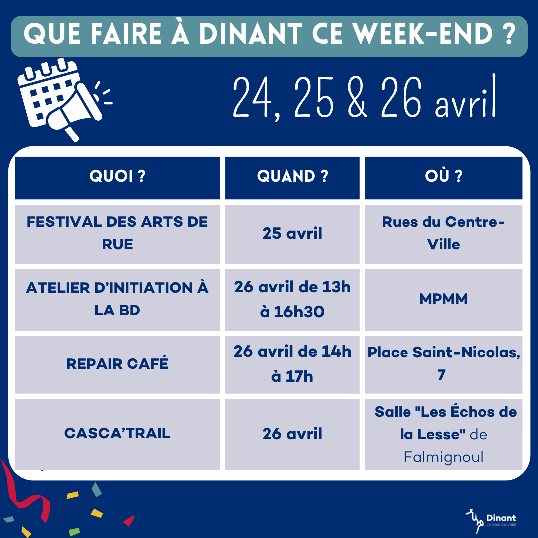 Si vous souhaitez partager vos évènements sur le territoire de Dinant, n'hésitez pas à nous contacter par email avec toutes les informations : communication@dinant.be