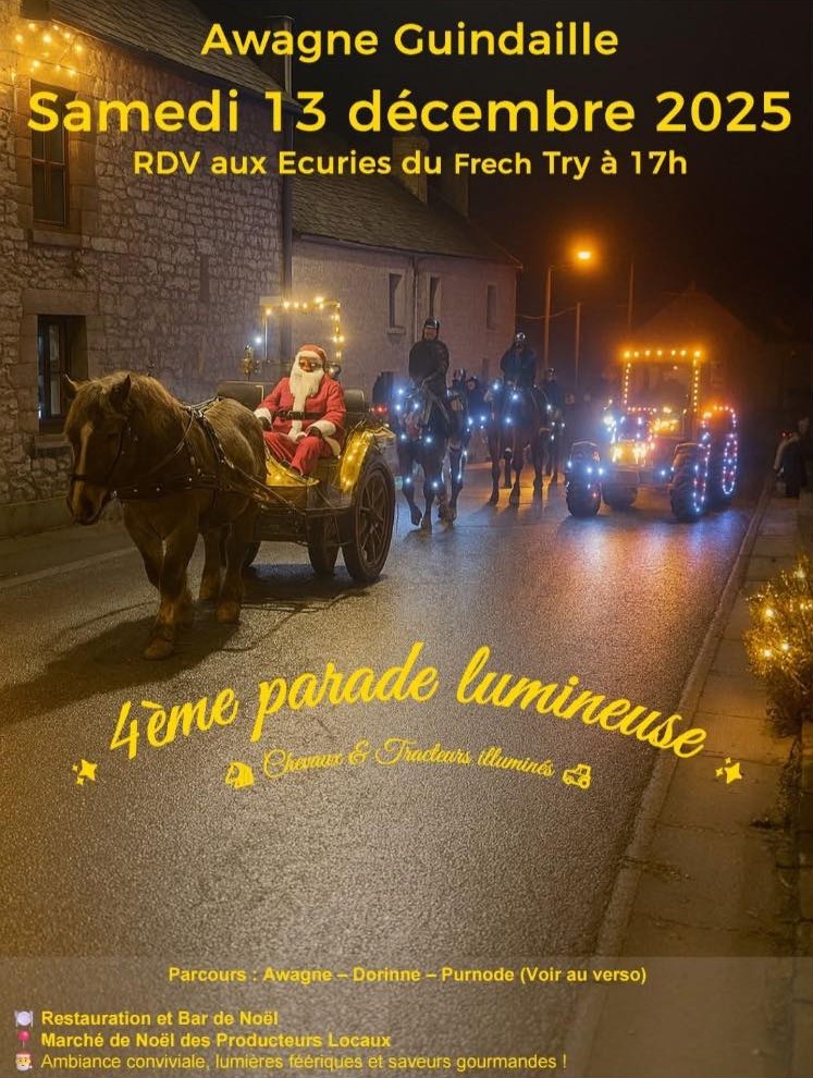 Venez découvrir la Balade des manèges et des tracteurs lumineux à travers les rues d’Awagne – Purnode – Dorinne. Un moment unique pour petits et grands, dans une ambiance festive et chaleureuse.