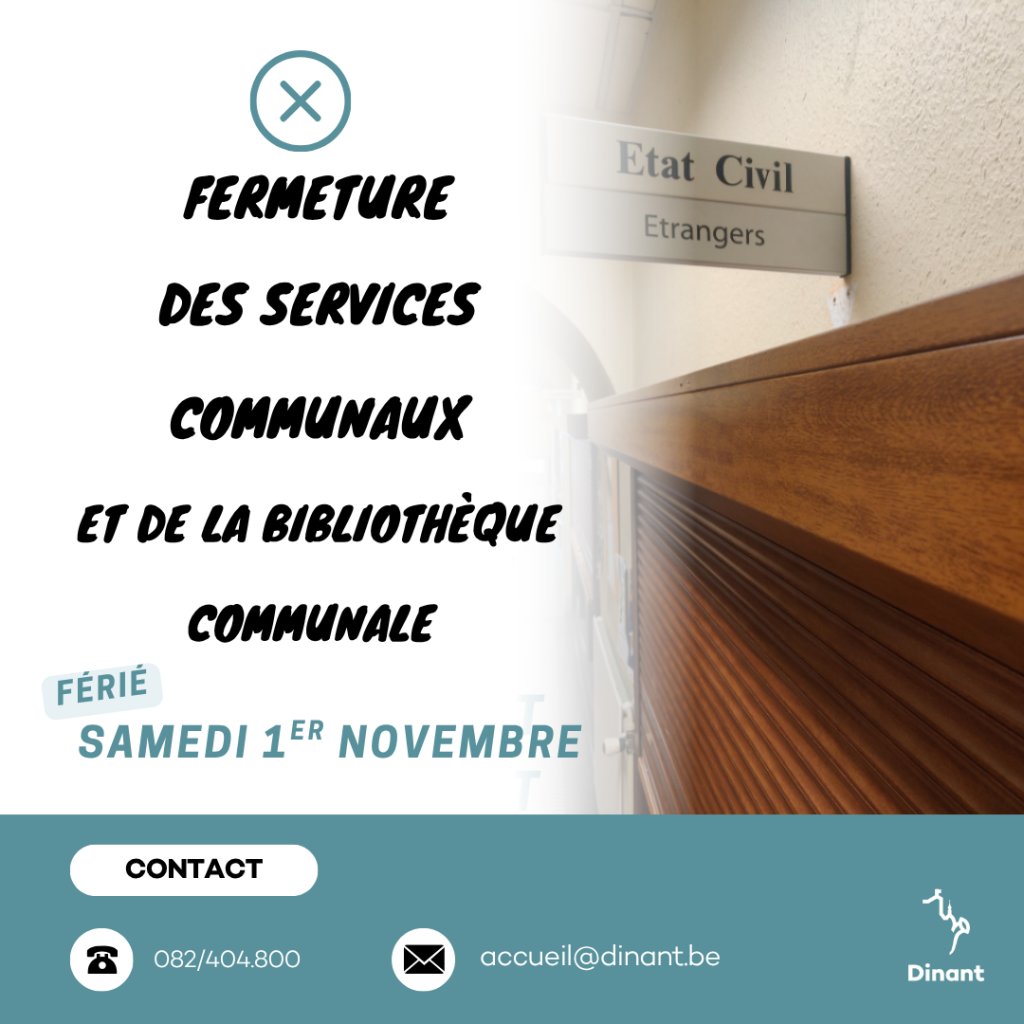 À l’occasion de la Toussaint, les services Population, Étrangers et État civil de la Ville de Dinant ainsi que la Bibliothèque communale de Dinant seront fermés au public ce samedi 1er novembre.
