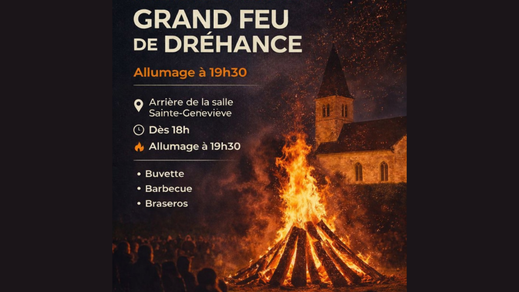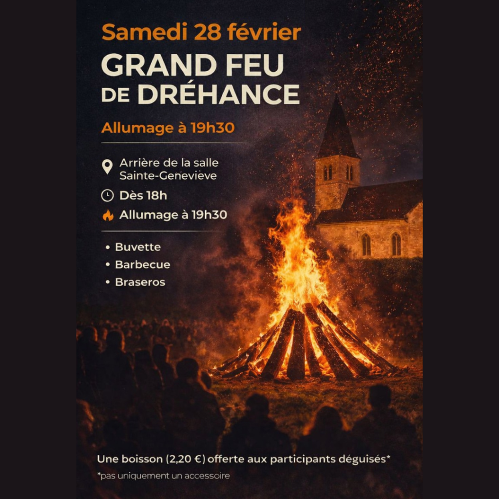 Le comité des fêtes de Dréhance vous invite à son traditionnel Grand Feu, un événement incontournable qui marque la fin de l’hiver dans une ambiance chaleureuse et festive !