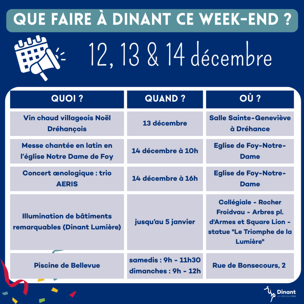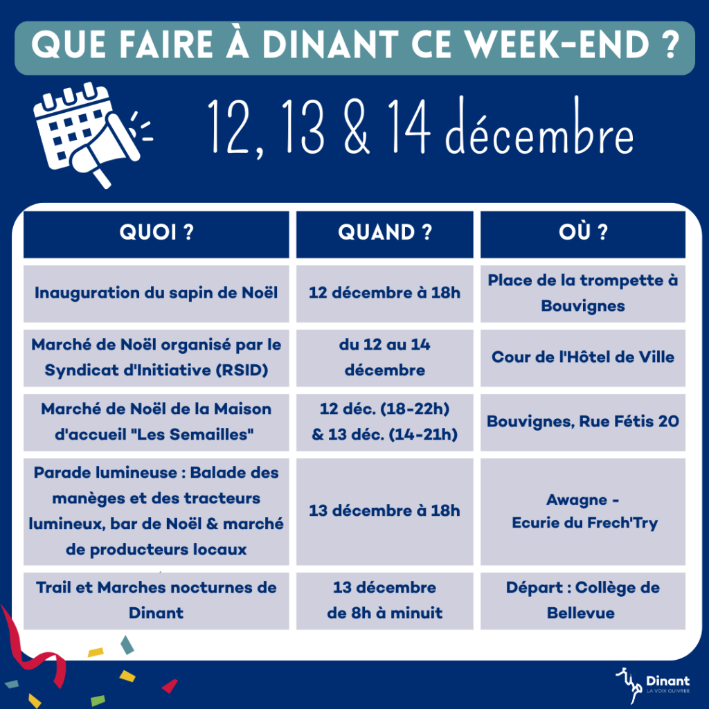 Découvrez les 𝗱𝗶𝗳𝗳𝗲́𝗿𝗲𝗻𝘁𝘀 𝗲́𝘃𝗲̀𝗻𝗲𝗺𝗲𝗻𝘁𝘀 𝗲𝘁 𝗮𝗰𝘁𝗶𝘃𝗶𝘁𝗲́𝘀 à faire dans notre belle commune, durant ce week-end du vendredi 12/12 au dimanche 14/12