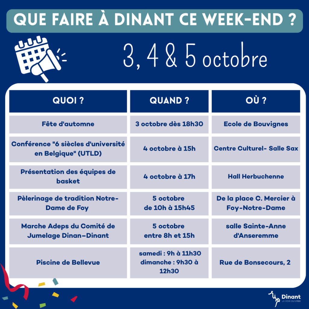 Si vous souhaitez partager vos évènements sur le territoire de Dinant, n'hésitez pas à nous contacter par email avec toutes les informations : communication@dinant.be