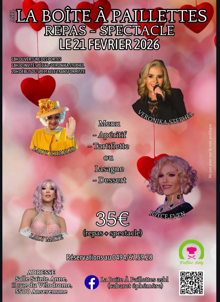 Le samedi 21 février 2026, profitez d’un Repas‑Spectacle mêlant bonne humeur, surprises et performances transformistes.