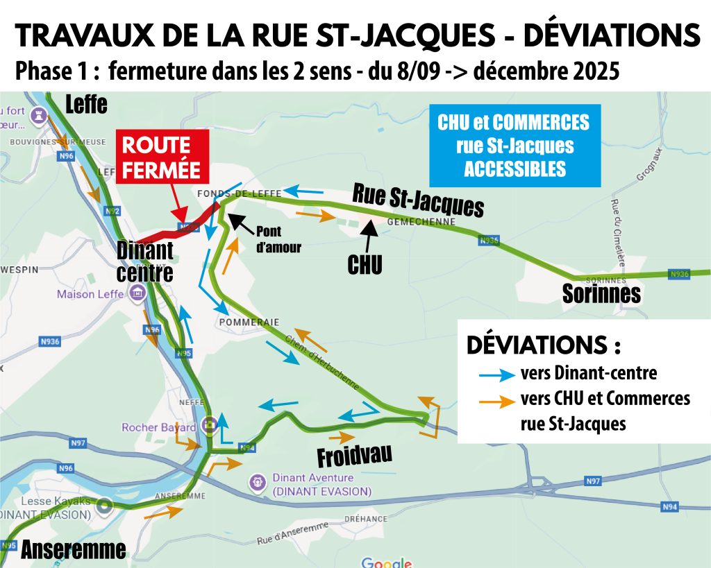 Plan de dĂ©viation â Phase 1 des travaux de la Rue Saint-Jacques (du 8/09 jusquâĂ fin dĂ©cembre 2025).