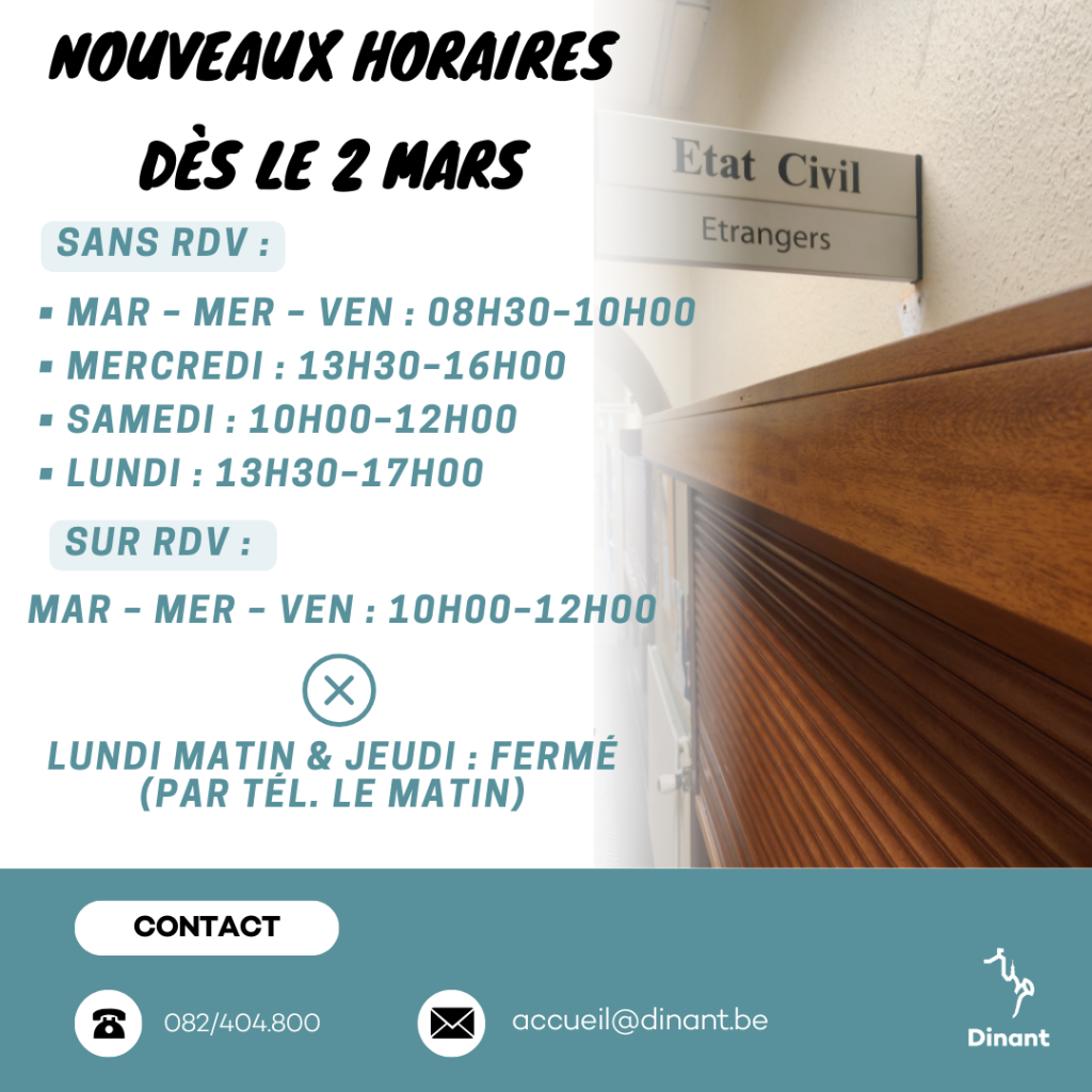 ⚠️ Ces nouveaux horaires concernent uniquement le service État civil – Population.