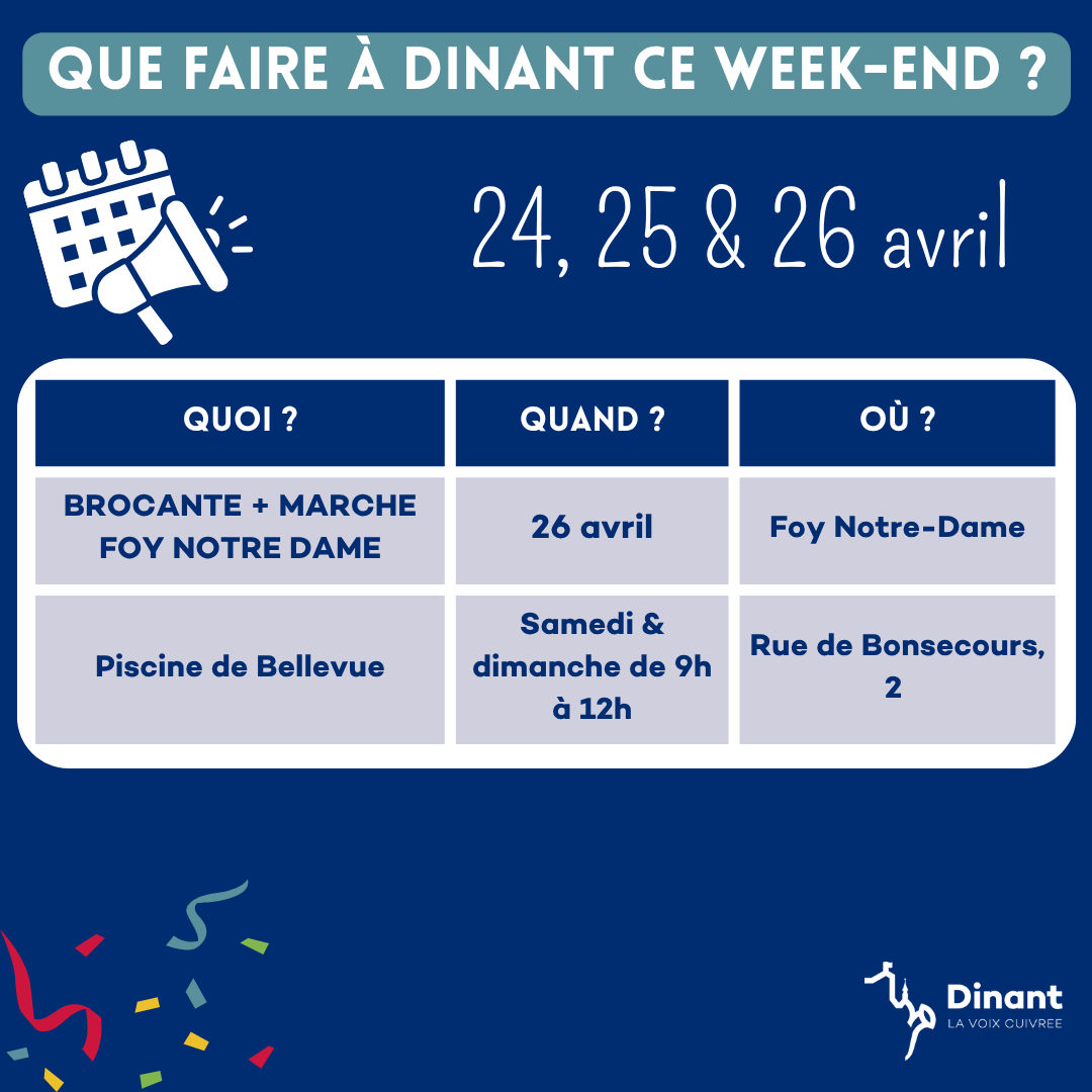 Si vous souhaitez partager vos évènements sur le territoire de Dinant, n'hésitez pas à nous contacter par email avec toutes les informations : communication@dinant.be