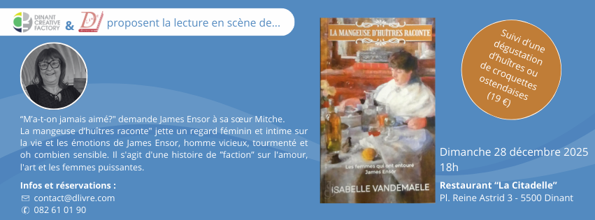 La mangeuse d’huîtres, un texte d’Isabelle Vandemaele, figure joviale et généreuse d’Ostende, qui aurait pu être la sœur spirituelle de James Ensor, tant son univers est empreint de fantaisie et de profondeur.
