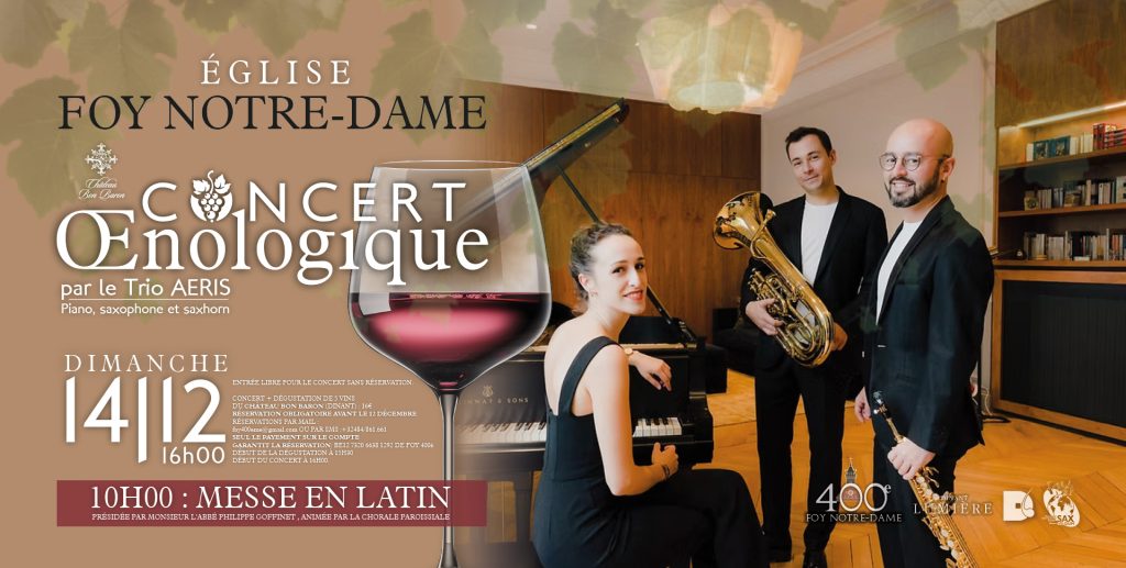 A la recherche des sonorités d’Adolphe Sax, venez découvrir le Trio Aeris, venant de Paris : piano, saxophone et saxhorn dans des œuvres pétillantes (N.Rota, F.Poulenc, …). Le concert sera accompagné d’une dégustation des vins de Bon Baron (Dinant).