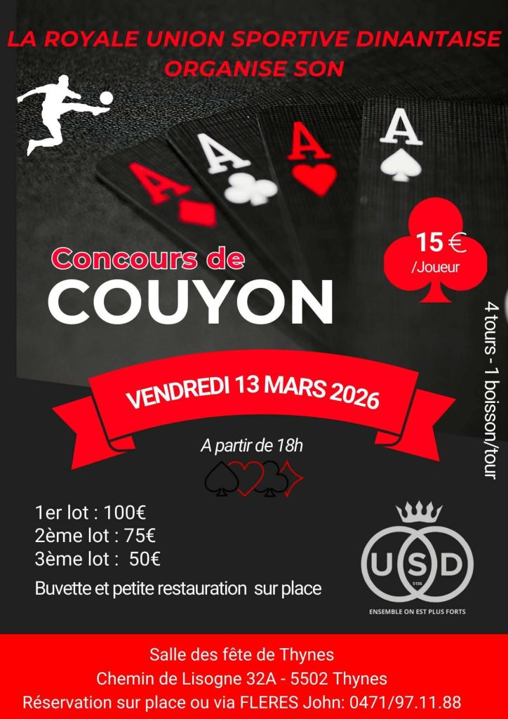 La Royale Union Sportive Dinantaise organise un concours de Couyon le vendredi 13 mars 2026, à partir de 18h, à la Salle des fêtes de Thynes, située Chemin de Lisogne 32A à 5502 Thynes. La participation est fixée à 15 € par joueur, et une boisson est offerte à chaque tour, pour un total de quatre tours.