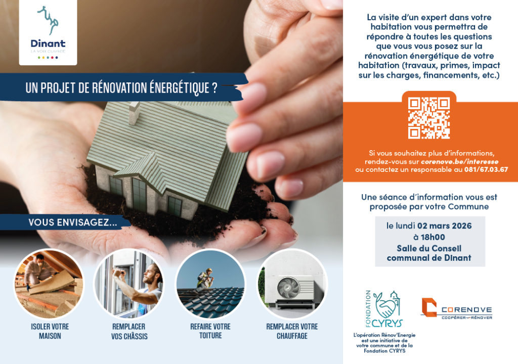La Commune de Dinant vous invite à une séance d’information dédiée à l’opération Rénov’Energie – CORENOVE, une initiative menée en collaboration avec la Fondation CYRYS.