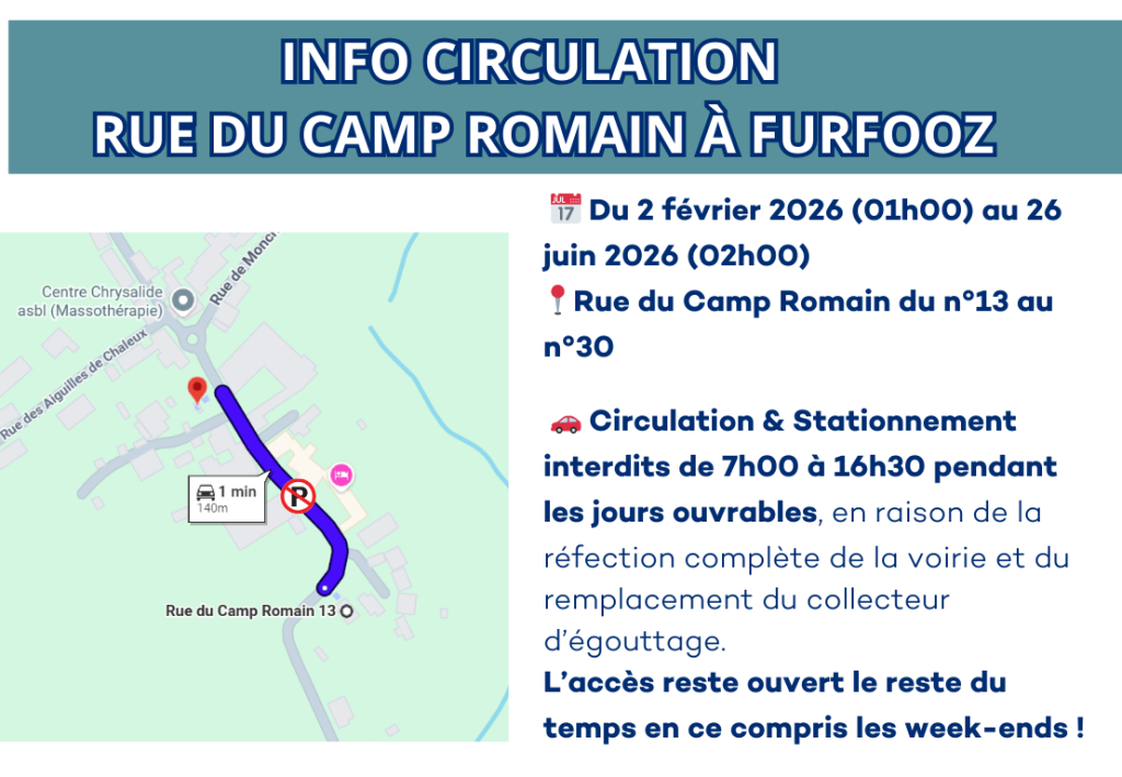 Suite à la réunion d’information destinée aux riverains qui a eu lieu début janvier, les travaux de réfection complète de la voirie et de remplacement du collecteur d’égouttage débuteront prochainement Rue du Camp Romain, 20 à Furfooz.